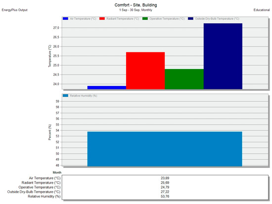 Figure 6 shows the performance of the indoor temperatures of the building and indoor relative humidity obtained from the simulation. The average indoor relative humidity (RH) stands at 53.76%, with an operative temperature of 24.79 °C. The operative temperature of the building is obtained from the arithmetic mean between the air temperature (23.89 °C) and the average radiant temperature (25.69 °C). However, in the measurements, the difference between the surface temperature of the walls and the air temperature was minimal. Consequently, a variance of approximately 0.51 °C exists between the measurements and the simulation for the operative average temperature, and roughly 2.8% for the average relative humidity. These findings offer a deeper insight into how climatic conditions impact the internal environment of the building, which is crucial for its design and energy efficiency.