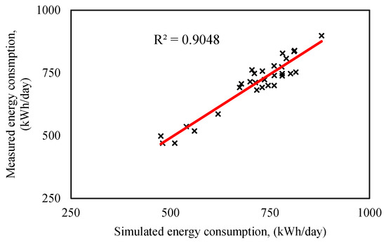 Scatterplot between measured and simulated values of energy consumption [30].