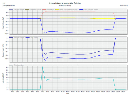 Therefore, using the reference model of the building, the behavior of the cooling thermal load obtained from the simulation for a typical day in September, from 6:30 a.m. to 9:30 p.m., is analyzed. The results of the hourly heat gains simulation for a typical day and the energy balance with building occupancy are shown in Figure 8.