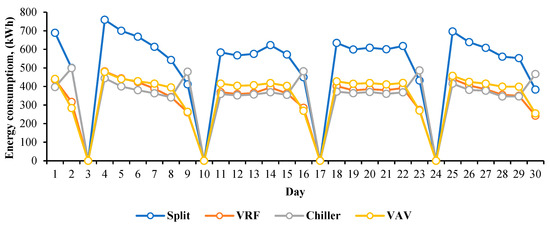The relationship between the building’s thermal load and the energy performance of AC defines the energy consumption. The operation of the building was simulated to estimate the monthly electricity consumption for the four AC technologies. Since the climate in the region is non-seasonal, simulations were carried out daily with the actual occupancy in a typical month, September. The results for the four AC technologies under study are shown in Figure 9.