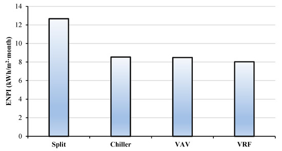 Considering the internal heat gains and weather data (temperature and relative humidity) for indoor and outdoor environments, energy consumptions (kWh/day) are analyzed for the building modelled and calibrated in the simulation software for 8760 h a year. Energy simulation is also helpful in comparing energy technologies’ performance in buildings, as it forecasts energy consumption, allowing a comparison between their energy performance, using the indicator of electrical consumption per area (ENPI). For AC systems, ENPI is calculated next (Equation (2)):
