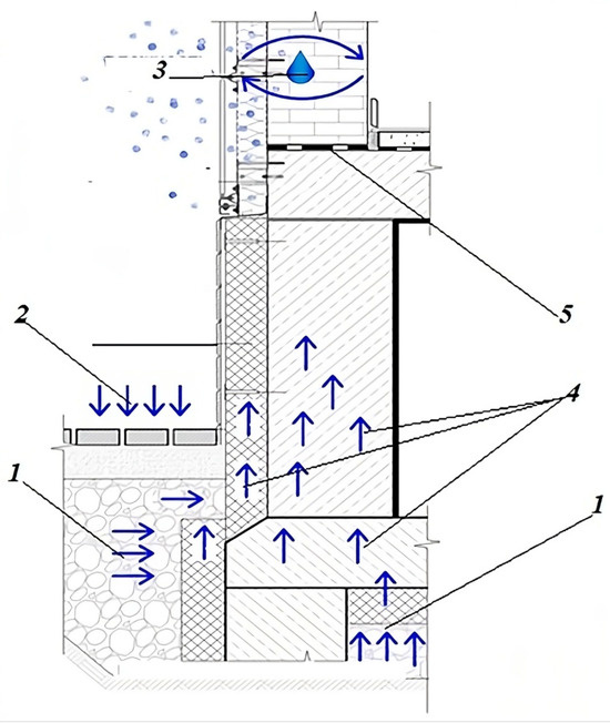Methods of moisture penetration into the structure: 1—ground moisture; 2—precipitation (snow, rain) and melt-water; 3—air humidity; 4—moisture filtration due to capillary phenomena; 5—waterproofing cut-off.