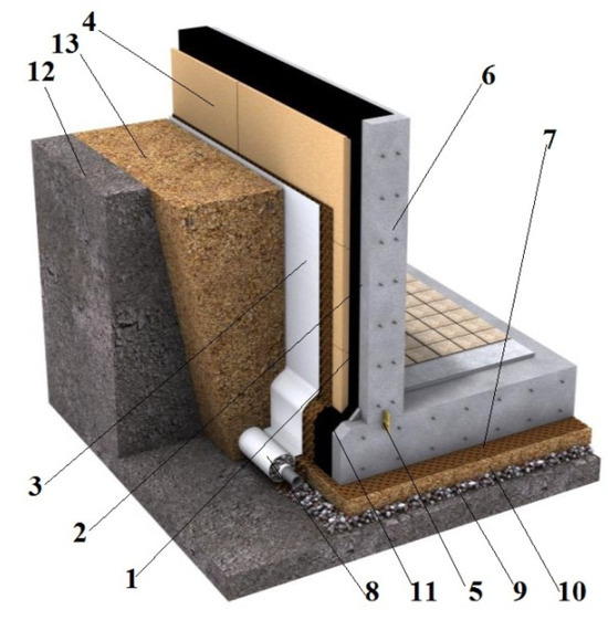 The system of heat–hydro–vapor barrier for the insulation of the operated basement: 1—waterproofing roll material; 2—bituminous primer; 3—profiled membrane PLANTER geo; 4—plates made of extruded polystyrene foam (XPS) or polyisocyanurate foam (PIR), or hekjys made of seamless polyethylene foam (PE); 5—PVC waterstop, central; 6—foundation wall; 7—profiled membrane PLANTER standard; 8—drainage pipe; 9—crushed stone preparation; 10—sand preparation; 11—transitional side (fillet); 12—base soil; 13—backfill soil.