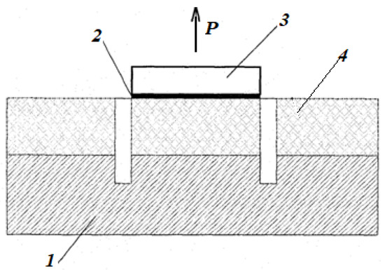 Pull test scheme: 1—base concrete (bearing structure); 2—polyepoxy glue; 3—metal disk; 4—waterproofing (repair) material; P is the direction of tension (application of the load generated by the test device).