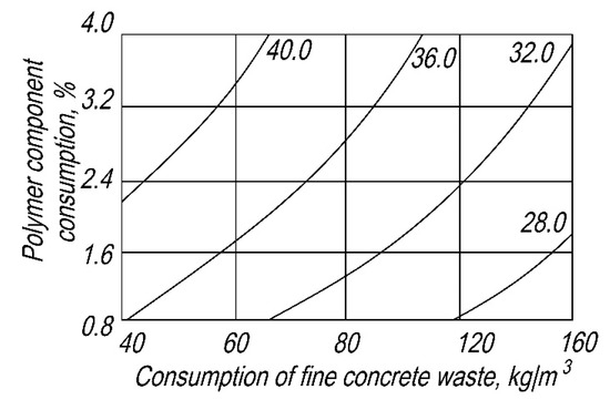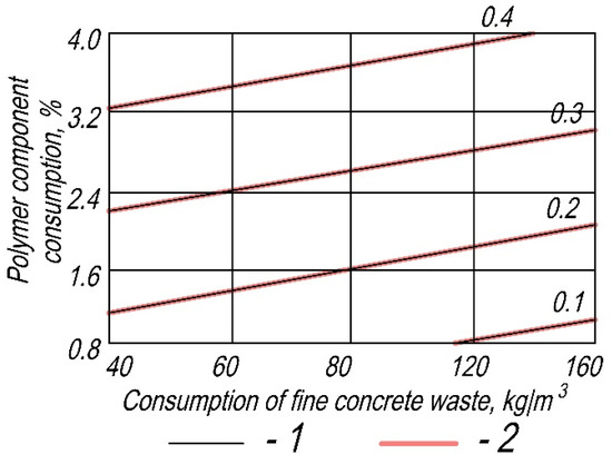 Stage 5. A nomogram was built for selecting the composition of a waterproofing (repair) material and solving a prognostic problem of mathematical modeling: predicting the properties of this material (Figure 6). The nomogram was constructed by combining the graphical interpretation of the optimized models (5) and (6).