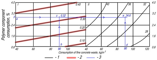 The procedure for solving the prognostic problem is as follows. The experimenter sets the values of the consumption factors of acrylate resin and the consumption of finely ground concrete waste. Let the consumption of acrylic resin be 3%; we marked the point “a” on the ordinate axis and drew a straight line (a, e) parallel to the abscissa axis through sectors I and II. We set the consumption of finely ground concrete waste 90 kg/m3. In sector I, from the point “b”, we raised the perpendicular to the intersection with the straight line (a, e) and at the intersection we achieved the point “c”, which corresponded to an adhesive strength of 0.32 MPa. In sector II, from the point “d” we raised the perpendicular to the intersection with the straight line (a, e) and at the intersection we achieved the point “e”, which corresponded to a compressive strength of 34.6 MPa. Optimal values of surface moisture (9.7…9.8%) and plasticizer consumption (0.38…0.39%) were previously determined as a result of analytical optimization.