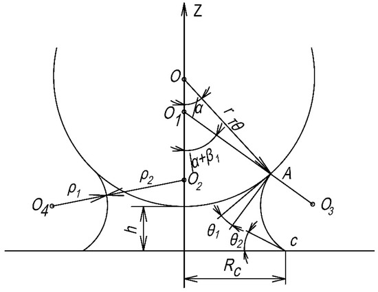 The capillary component of the adhesion of a mineral particle to a flat concrete surface (Figure 7) depends on the coefficient of surface tension of thin water films (σ, N/m), as well as capillary pressure (Pk, Pa), determined through the main radii of curvature of the liquid cuff (ρ1 and ρ2, m) and can be calculated from the formulas: