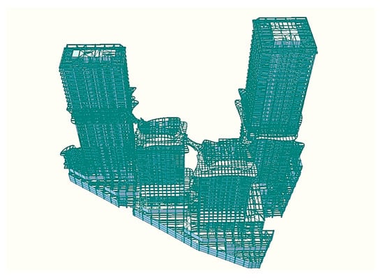 Zhuhai Tiejian Square is located on the east side of Huandao East Road, Hengqin New District, Zhuhai City, Guangdong Province, which can be seen in Figure 1. The specific sub-project includes T1–T4 office buildings and podium buildings; see Figure 2. The height of the T1 tower is 179.55 m, the height of the T2 and T3 towers is 99.85 m, and the height of the T4 tower is 145.85 m, which can be seen in Figure 2.