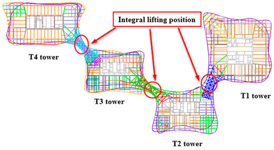 The project has four towers (T1–T4) with five high-altitude steel-structure connecting bridges: the elevations of the two steel bridges between T4–T3 are 94.1 m and 84.3 m respectively, the elevations of the two steel bridges between T3–T2 are 94.1 m and 89.2 m respectively, and the elevation of the one steel bridge between T1–T2 is 89.2m, with a total weight of about 280 tons, which can be seen by Figure 3 and Figure 4. The total weight of the two steel bridges between T4–T3 is about 120 t, the total weight of the two steel bridges between T3–T2 is about 100 t, and the weight of the steel bridge between T1–T2 is about 60 t. The cantilever beam is a steel structure with a maximum cantilever length of 13 m, and the floor is made of reinforced concrete composite slab. The building is connected to the four towers at the above height through the steel-structure bridge, and the outer contour is mostly a variable diameter curve and suspended. The three steel-structure connecting bridges are all constructed by adopting the lifting idea of “low-altitude hoisting and overall lifting”. Firstly, the main part is assembled by using a truck crane on the diaphragm frame on the ground, and then the steel structure bridge is lifted as a whole by using the lifting device established on the main structure of the tower. After being lifted to the specified height, the remaining bars are assembled and fixed, and the sling is unloaded. According to the spatial position of the four towers, three lifting construction sections are divided, namely, lifting zone 1 (T3–T4), lifting zone 2 (T2–T3), and lifting zone 3 (T1–T2). This paper selects the steel-structure connecting bridge with lifting zone 3 (T1–T2) as the research object and establishes a unidirectional fluid-structure coupling model to calculate and analyze the lifting processes under wind loads.