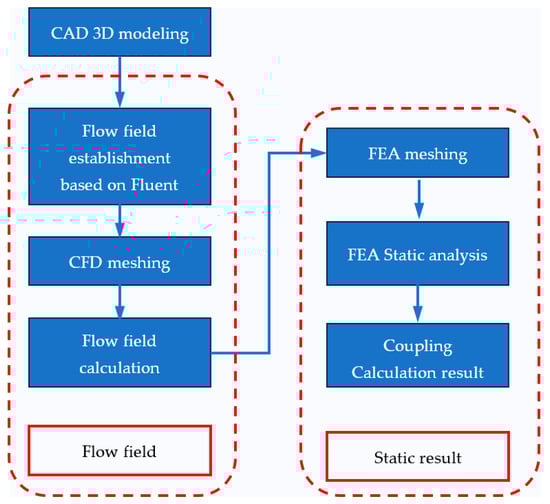 This paper studies the second major type of coupling problem, that is, the coupling of structure and fluid only occurring on the contact surface. The Fluent module and Static Structural module in the finite element software ANSYS Fluent 2022 R1 are used for data exchange modeling. The structures will deform when they are subjected to pressure on the surface. For the movement of fluids, the solid structure in the deformation process will in turn produce a specific effect []. The analysis method of unidirectional fluid-structure coupling can be used to study the effect of flow field under the instantaneous change of airflow, that is, when two physical fields are solved in a certain order, and then the results on the boundary of the two physical fields are applied to one physical field as boundary conditions, and another physical field is solved iteratively. The specific coupling process is shown in Figure 5. After the establishment of the geometric model, the Fluent module is used to determine the flow field model and divide the grid. After that, the calculation and analysis of the flow field are carried out to obtain the specific distribution data of the flow field. The fluid pressure on the surface of the coupling between the flow field and the structure is transformed into the static external load of the solid, and the solid is meshed and analyzed in the Static Structure calculation module to obtain the stress distribution and displacement analysis of the structure under the impact of the fluid transient flow.