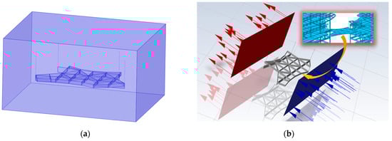 The division of the fluid field is shown in Figure 6a, which is a rectangular body. One side is set as the air inlet (blue), one side is set as the air outlet (red), and the other four sides are closed walls. Taking into account the influence of the structure around the steel-structure connecting bridge on the flow field, the angular direction of the air inlet is adjusted according to the design drawings. The whole working condition is shown in Figure 6b, the blue side of the rectangular body is the air outlet, and the red side is the air inlet. The air speed of the air inlet is set to two working conditions, which are 5 m/s and 10 m/s, respectively. The air density is set to 1.225 kg/m3, and the viscosity is set to 1.789 × 10−5 kg/(m × s). The whole flow field is calculated by using a diffuse smooth dynamic grid.