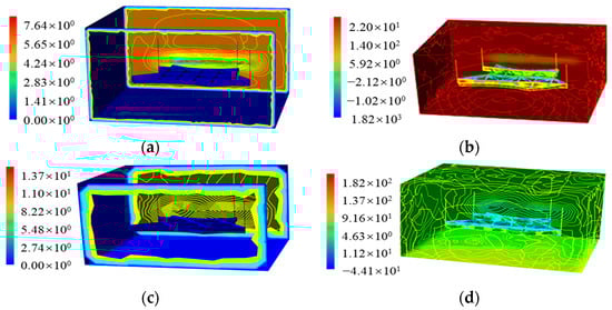 Fluid-structure coupling calculation results. (a) Total deformation distribution (mm) (wind speed: 5 m/s) (b) Equivalent stress distribution (Pa) (wind speed: 5 m/s). (c) Total deformation distribution (mm) (wind speed: 10 m/s). (d) Equivalent stress distribution (Pa) (wind speed: 10 m/s).