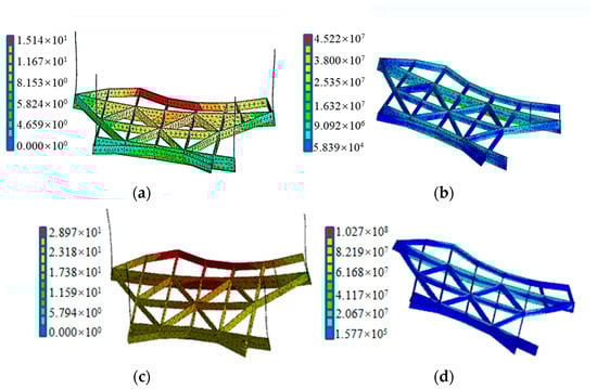 Now, the deformation analysis shows that at a wind speed of 5 m/s, the maximum deformation of the bridge structure reaches 15.141 mm. It can be seen from Figure 8a that the four slings have obvious deformation, indicating that the hoisting structure will still produce a considerable degree of deformation even under a small wind speed. This also shows the sensitivity of the hoisting structure to wind load. In addition, it can be seen that the position of the maximum deformation is the position where the steel structure bridge is closest to the outlet. It can be seen from Figure 8c that under the wind speed of 10 m/s, the maximum deformation of the connecting bridge structure reaches 28.970 mm. Compared with the condition of lower wind speed, the deformation distribution of the bridge structure does not change much, but the deformation amplitude increases.