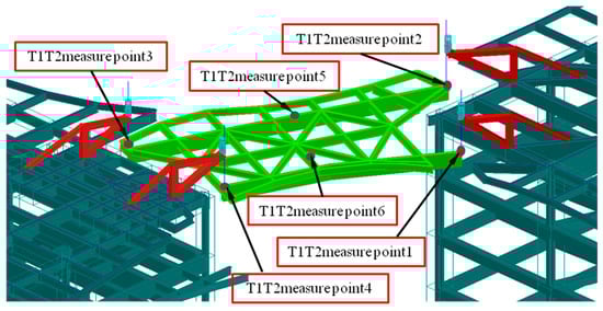 The T1–T2 zone is a one-layer steel bridge, and there are no I-beam members for temporary connection on the raised bridge. During the lifting, six measuring points were arranged on the connecting bridge to be lifted, one measuring point was arranged on the main longitudinal beam of the steel connecting bridge, one measuring point was arranged on the beam of the connecting bridge, and the other four measuring points were arranged on the members of the lower lifting point, as shown in Figure 9. In Figure 9, measuring point 5 is arranged on the lower surface of the beam, that is, the compression side, and measuring point 6 is arranged on the lower surface of the beam, that is, the tension side.
