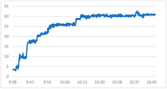 The monitoring personnel monitored the whole process of the formal lifting construction process of the T1–T2 bridge, and the data were complete and good. The whole lifting process was relatively stable, the influence of the external environment was lower, and the lifting process was smooth, achieving the purpose of on-site monitoring. Figure 14 shows the monitoring site photos of the monitoring personnel during the whole process of formal upgrading.