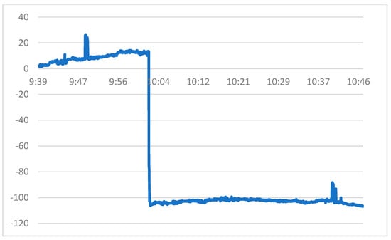 Figure 10 and Figure 11, respectively, give the curves of the whole process of strain change of measuring point 1 and measuring point 5. It can be seen that during the first lifting process, measuring point 1 is subjected to tensile force and gradually becomes larger, while measuring point 5 changes abruptly from positive to negative at around 10:00, indicating that a certain bending moment of the main beam is generated at this time, resulting in compressive stress at the measuring point.