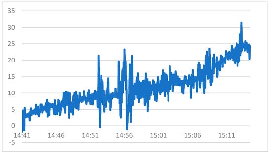 It is worth noting that, as shown in Figure 15 and Figure 16, the data of measurement point 1 and measurement point 5 has a small mutation in the time periods of 8:30–9:00 and 14:00–14:30, which indicates that at this stage, the force of the rod where the measurement point is located is affected by the instability of lifting, but the mutation value is not large and decreases rapidly. This shows that the company lifting the steel-connected bridge has adjusted for unstable situations, and the force of the component is more reasonable.