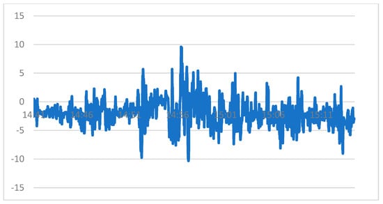 Strain change curve of measuring point 5 during the second pre-lifting. (Vertical axis unit: ×10−6).