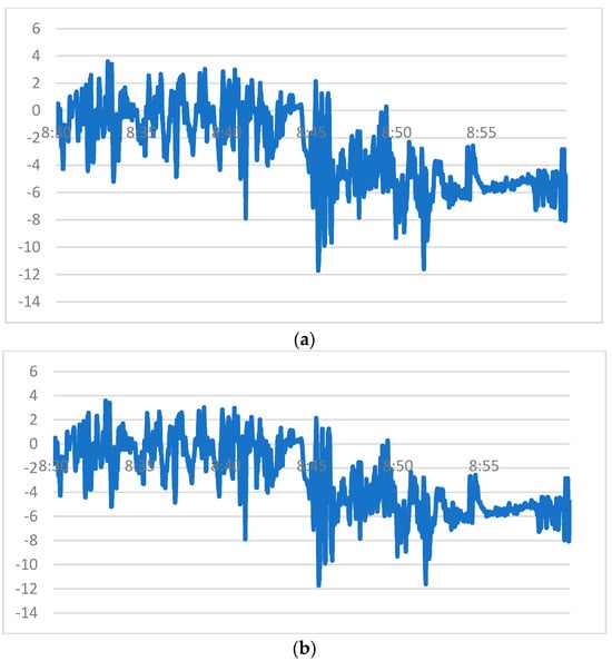 Strain change curve of measuring point 5 during formal lifting. (a) 8:30–9:00 (Vertical axis unit: ×10−6) (b) 14:00–14:30 (Vertical axis unit: ×10−6).