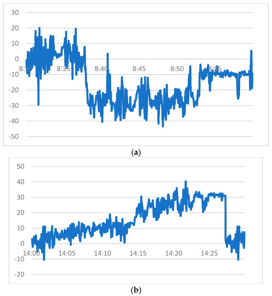 Strain change curve of measuring point 1 during formal lifting. (a) 8:30–9:00 (Vertical axis unit: ×10−6) (b) 14:00–14:30 (Vertical axis unit: ×10−6).