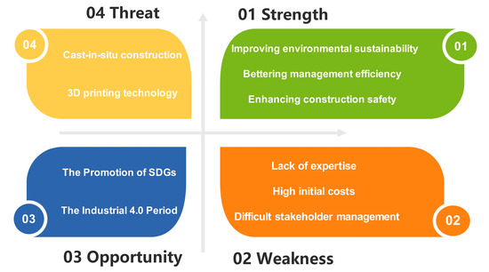 Given the current research circumstances, it is imperative to undertake a comprehensive inquiry into the external environment of using modular construction. The strengths, weaknesses, opportunities, and threats (SWOT) analysis encompasses four key domains: opportunities, risks, advantages, and disadvantages [48]. Through the application of this analytical tool, an evaluation of the external environment of using modular construction is conducted, which mainly assesses the benefits and drawbacks of this construction method. A SWOT analysis of prefabrication in building projects is illustrated in Figure 2. The advantages and disadvantages of prefabrication are discussed in previous parts. Regarding the opportunity part, the Industrial 4.0 period promotes modular constructions, improving the working efficiency and project scope accuracy [49]. The worldwide promotion and effective implementation of SDGs can also be a positive factor in facilitating the use of prefabricated buildings, which can reduce the environmental impact on the negative side [50]. Moreover, the threat of using prefabrication requires consideration of other construction methods, which have similar functions for completing construction projects. For instance, the cast-in-situ method is not an environment-friendly building approach, but it is a mature and traditional way in which social acceptance is high. At the same time, 3D printing technology is limited to the building height, but it can improve cost efficiency and reduce the project timeline to some extent [51,52].