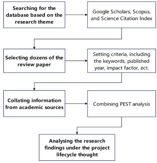 This paper mainly explores the research topic based on an extensive literature review. By studying a few academic papers focusing on the engineering management topic [28,55,56], the specific process of this research is elaborated, as shown in Figure 3. The study relies on desk research, and the information is collated from academic journals, conference proceedings, official news, technical reports, and other convincing sources. This desk research will be developed by following the steps explained above. The first step is to search the online school library, Google Scholar, Scopus, and Science Citation Index to preliminarily investigate hundreds of theme-related papers. Then, the researcher elaborately refined the selections by setting more accurate keywords and prioritising reputable publications and more recent published years (the total number of selected articles is over 60). After that, PEST analysis is essential to summarise the research findings from different aspects more comprehensively and clearly. Using the PEST analytical tool, the identified barriers can be grouped into political, economic, social, and technological aspects, which can determine possible solutions in further investigations. The proposed research findings should be convincing and comprehensive for other secondary research in the relevant construction study field.