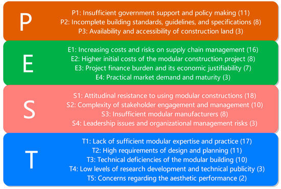 By excluding the relevant factors figured out only once, the statistical data of the major barrier occurrence in each article are concluded in Figure 4. A PEST analysis aims to classify the external factors as political, economic, social, and technological aspects, outlining a clear analytical result of collated barriers [102]. Specifically, the political barriers involve insufficient government support and policy making (11 times) and incomplete building standards, guidelines, and specifications (8 times). The economic obstacles are increasing costs and risks on supply chain management (16 times), higher initial costs of the modular construction project (8 times), and project finance burden and its economic justifiability (7 times). As for the social aspect, attitudinal resistance to using modular constructions (18 times), the complexity of stakeholder engagement and management (10 times), and insufficient modular manufacturers (8 times) are significant contributions. Moreover, the technological factors include but are not limited to a lack of sufficient modular expertise and practice (17 times), high requirements of design and planning (11 times), and technical deficiencies of the modular building (10 times). Based on the data statistics, the top five barriers are determined and ranked from No. 1 to No. 5 as the attitudinal resistance to using modular constructions (the social aspect), lack of sufficient modular expertise and practice (the technological factor), increasing costs and risks on supply chain management (the economic obstacle), insufficient government support and policy making (the political barrier), and high requirements of design and planning (the technological aspect). The complexity of stakeholder engagement and management has been presented 10 times, which has the same situation as the technical deficiencies of the modular building. Based on the findings from Table 1, political factors can make contributions for both developed and developing regions or countries. It can be inferred that underdeveloped regions should focus on the technological aspects, while developed regions should pay more attention to the social acceptance level of promoting new construction methods. This PEST analysis is well-rounded because the identified top barriers refer to all aspects, including political, economic, social, and technological factors. In other words, promoting prefabrication in building projects can be seen as a comprehensive issue instead of only focusing on a single analytical aspect. Meanwhile, these collated impeding factors should be analysed further for more profound insight.