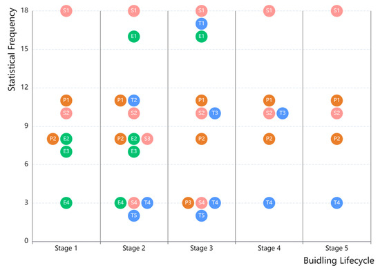 Although Figure 4 classifies and ranks the significant obstacles in sequence, dividing these barriers into different stages according to the building project lifecycle is also essential. Under critical consideration, the research teams put the influential factors (identified in the proposed PEST analysis) into a project lifecycle analysis (considering the analysis from Figure 1), as elaborated in Figure 5. In terms of the horizontal axis in Figure 5, the whole lifecycle of modular construction projects generally includes the conceptual design and decision-making analysis (stage one), pre-construction preparation (stage two), formal construction and product delivery (stage three), operation and maintenance (stage four), and construction of waste and demolition (stage five). As for its vertical axis, it considers the statistical data collated from Figure 4. The major identified barriers are marked in Figure 5 throughout each stage during the modular building lifecycle. It can be seen that each building lifecycle stage faces different promoting barriers.