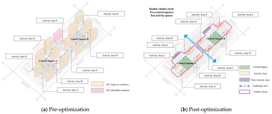 - The pre-optimization scenario simulation includes four active functions: the west zone central plaza, children’s activity area, east zone central plaza, and elderly activity area. The post-optimization scenario simulation includes eight active functions: each of the east and west zones includes a central plaza, entertainment plaza, children’s activity area, and elderly activity area.