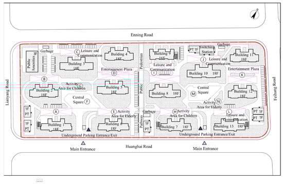 As depicted in Figure 2, considering the project encompasses 12 areas suitable for activity function placement, it becomes imperative to assess the spatial basic conditions of these areas in alignment with planning requirements. The initial plan includes additional children’s activity areas and elderly activity areas in the central squares of the east and west. Consequently, the project boasts a total of 14 designated areas (from A to N) for activity functions. The allocation of activity functions to edge activity spaces should be tailored to specific circumstances []. For instance, smaller spaces like A, B, C, J, and L could be designated for leisure and communication functions, while a larger space like K could incorporate functions such as a sub-center square based on the overall plan. The details are delineated in Table 1.