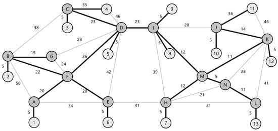 Numerous scholars also have conducted research on its effectiveness. For instance, Hua explored the optimization of e-commerce logistics distribution schemes using Kruskal’s algorithm for the minimum spanning tree, validating its feasibility in logistics distribution []. Similarly, Huang investigated the optimization of public transportation networks leveraging graph theory and Kruskal’s algorithm, achieving favorable outcomes []. Wang and He delved into optimizing transportation planning routes using Kruskal’s algorithm for the minimum spanning tree, demonstrating notable improvements in transportation route efficiency compared to actual transportation samples [].