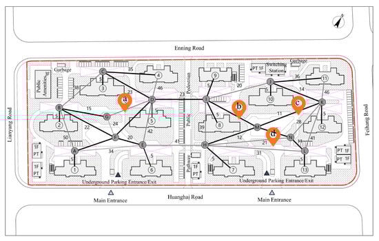 - A pathway at location d (between the elderly activity area N and leisure and communication area L) should be added to strengthen the connection between activity spaces L and N. In the eastern area, the pathway linking areas M, N, and L stands as the sole connection. Given the substantial pedestrian flow pressure experienced in area N, it becomes imperative to extend the pathway adjacent to area M. Introducing a new pathway, denoted as pathway d, emerges as a viable approach to alleviate the pressure and enhance connectivity.