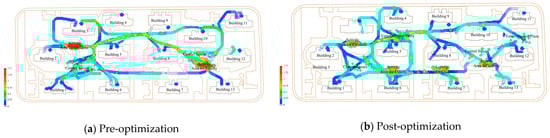 Conversely, the post-optimized plan reveals fewer areas with high pedestrian flow density between activity functions, indicating improved spatial accessibility and appropriate road widths between public space activity functions.