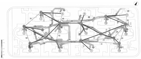 Subsequently, the pedestrian flow density map of the post-optimized plan for the public spaces of the high-rise residential project in Shanghai is overlaid with the corresponding minimum spanning tree, as depicted in Figure 6.