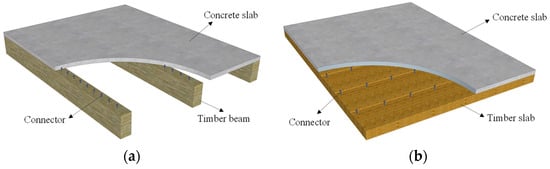 Diagrams of the TCC floor: (a) with timber beams and (b) with a timber slab.