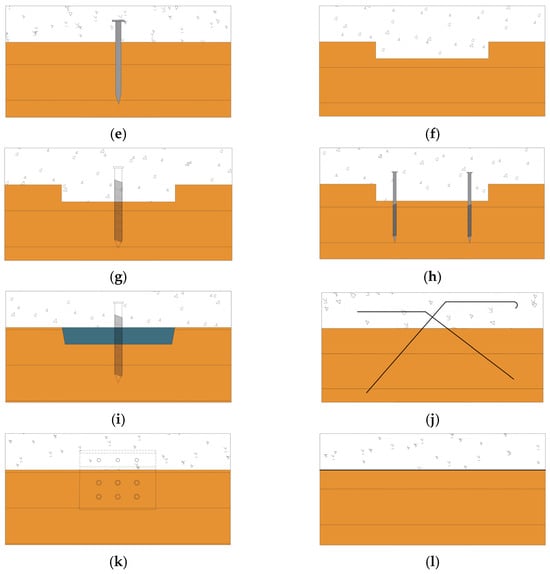Connection configuration: (a) dowels; (b) dowels with an interlayer; (c) Tecnaria connector; (d) inclined screw; (e) coach screw; (f) notched connector; (g) notch with coach screw; (h) notch with STS; (i) X-connector; (j) bonding; (k) bonding; and (l) steel plate connector.