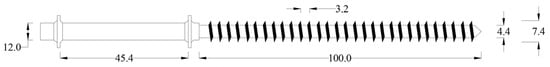 Fragiacomo [] investigated the long-term slip of TCC shear connectors with inclined STS (see Figure 2d). The STS types adopted were also VB48-7.5×100 screws (see Figure 3). An oriented strand board (OSB) with a thickness of 15 mm was set between the timber and concrete. The slip modulus at the serviceability limit state was 12.0 kN/mm, while the creep coefficient was about 0.66 after 421 days of loading.