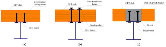 Steel-timber shear connectors reported by Chiniforush et al. []: (a) coach screw or dog screw; (b) post-tensioned bolt; and (c) bolt in grout pocket.