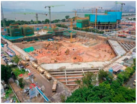 This paper is based on a project located near the Deep Bay Metro Station in the reclamation area of Shenzhen City. The surrounding area of the foundation pit covers approximately 10,670 m2 and is within the protected zone (50 m) of Shenzhen Metro Line 9 and Line 11. The foundation pit is located about 5 m away from the closest structure of Metro Line 9 station and approximately 10.5 m away from the outer boundary of Metro Line 11 tunnel structure. The elevation of the nearby tunnel top is approximately −17.4 m. The outer diameter of the tunnel is 6.7 m, and the thickness of the concrete lining segments is 350 mm with a concrete strength of C35. The plan view of the foundation pit–tunnel layout and aerial photograph of the site are shown in Figure 1, Figure 2 and Figure 3. The parameters of the supporting structure are presented in Table 1.