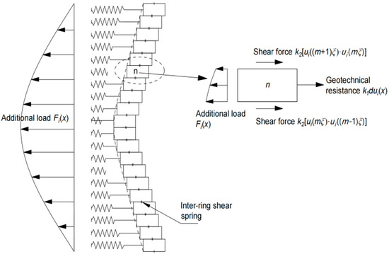 where Fi(x) represents the additional load acting on the tunnel; d is the outer diameter of the tunnel; σi(x) is the additional stress acting on the tunnel (the specific solution can be found in a study by Niu et al. [13]); i represents horizontal and vertical directions; k1 and k2 are foundation bed coefficients and shear stiffness between rings, respectively; and u represents the tunnel displacement.