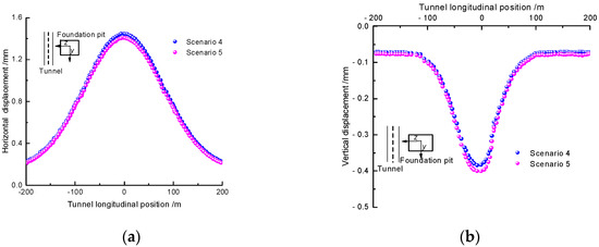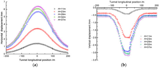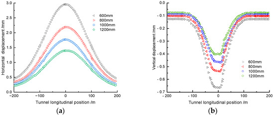 Tunnel structure deformation at different pit depths. (a) Horizontal displacement; (b) vertical displacement.