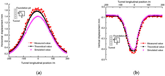 The horizontal and vertical displacement numerical results were extracted from the mid-axis of the right bottom surface of the tunnel structure and plotted in Figure 6. During the excavation of the foundation pit, the horizontal displacement of the mid-axis of the tunnel sidewall is shown in Figure 6a. As the excavation depth of the foundation pit increases, the horizontal displacement gradually increases. Especially within the range of the foundation pit excavation (−90 m to 90 m), the tunnel is significantly affected, and there is clear correspondence between the overall lateral displacement deformation region of the tunnel and the range of the foundation pit excavation. Within the foundation pit excavation range, the tunnel exhibits larger horizontal displacements, noticeably exceeding the horizontal displacements generated by the tunnel sections outside the excavation range. As the distance from the foundation pit excavation range increases, the horizontal displacement of the tunnel gradually decreases. The horizontal displacement curve shows that the model is symmetrical, with a maximum horizontal displacement of 1.4 mm, indicating small deformations.
