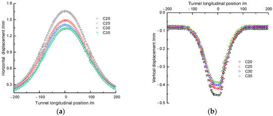 Influence of ground wall material on tunnel deformation. (a) Horizontal displacement; (b) vertical displacement.
