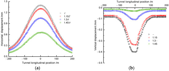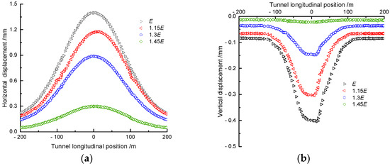 Influence of increasing elastic modulus on tunnel deformation. (a) Horizontal displacement; (b) vertical displacement.