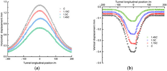 Influence of increasing cohesion on tunnel deformation. (a) Horizontal displacement; (b) vertical displacement.