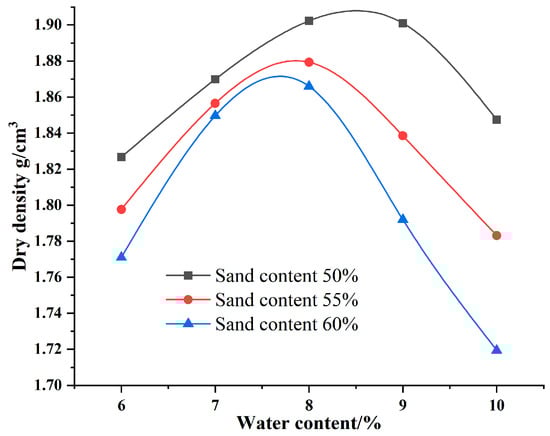 This experiment analyses the content of sandy soil in the north Hebei region and uses powdery clay from the Zhangjiakou region for configuration. After air-drying and crushing, the fine-grained clay with less than 0.075 mm was taken and placed in a cool and dry place for storage. Standard sand was mixed with the fine clay to create three soil mixtures with sand contents of 50%, 55%, and 60%. After mixing the sand and clay uniformly, the resulting soil was dried and then subjected to compaction and direct shear tests. The experimental data pertaining to the fundamental physical characteristics of sandy soil are presented in Figure 1 and Table 1. For anchoring, M8 ribbed steel bars and cement mortar were used, with ordinary Portland cement of strength grade 42.5. The cement mortar mix ratio of standard sand−ordinary Portland cement−water was 1:1:0.45, and the uniaxial compressive strength of the cement mortar was measured to be 21 MPa.
