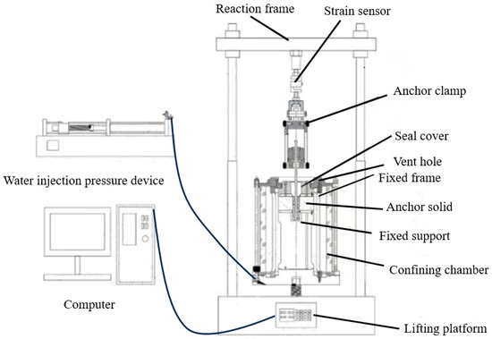 This test apparatus is based on a permafrost triaxial apparatus, which contains a confining pressure system, a fixing system, a control system, and an acquisition system. The shear test system for anchors is shown in Figure 2. The whole instrumentation unit consists of a lifting platform, a steel base, a fixed support, a pumping cylinder wall, a confining pressure chamber, a fixed frame, an anchor centring device, an anchor fixture, a force transducer, and a counterforce frame beam. First, the solid anchor is maintained on the upper end of the fixed support through holes, and then a rubber film is installed on the wall of the pumping cylinder. The pumping machine is used to tightly attach the rubber film to the cylinder wall. The smooth cylinder wall is set on the solid anchor, the pumping machine is turned off so that the rubber film is tightly adhered to the solid anchor, and then rubber bands are placed around the rubber film to prevent water seepage. Afterwards, the fixed frame is installed and surrounded by the pressure chamber, and the different components are connected with a sealing ring to ensure that the device is sealed and airtight. During the pulling process, the bars are kept in the centre by means of an anchor centring device and clamps to ensure vertical pulling. After the specimen is installed, it is pressurised with liquid with a water-filled pressurising device. When the confining pressure reaches the target value, a pressure balancing device is activated to stabilise the confining pressure at the set value. Subsequently, the lifting device is activated, the steel base drives the solid anchor to move downwards at a rate of 1 mm/min, the force between the anchor and soil are transmitted to the acquisition system through the force sensor, and the force and displacement data are collected through the data acquisition instrument. Throughout the anchor pulling process, the shear of the anchor-soil contact surface is always kept constant to ensure the accuracy of the test.