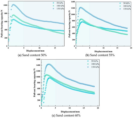 For the sample with a sand content of 50%, the peak load increases from 653.45 N to 1015.91 N; for the sample with a sand content of 55%, the peak load increases from 769.58 N to 1220.04 N; for the sample with a sand content of 60%, the peak load increases from 969.85 N to 1435.97 N. The confining pressure is positively correlated with the peak load, and appropriately increasing the radial stress of the anchoring body can increase the friction and particle interlocking force at the anchor-soil interface, thereby improving the bearing stability of the anchor rod. By controlling the constant confining pressure and observing the effect of increasing the sand content on the peak load, which is under 50 kPa, when the sand content of the specimen increases from 50% to 60%, the peak load increases by 316.39 N; under 100 kPa, the peak load increases by 308.71 N; and under 150 kPa, the peak load increases by 420.07 N. It can be seen that appropriately increasing the sand content also helps to increase the stability of the soil and improve the pull-out resistance of the anchor rod.