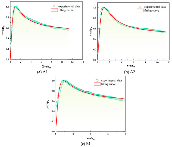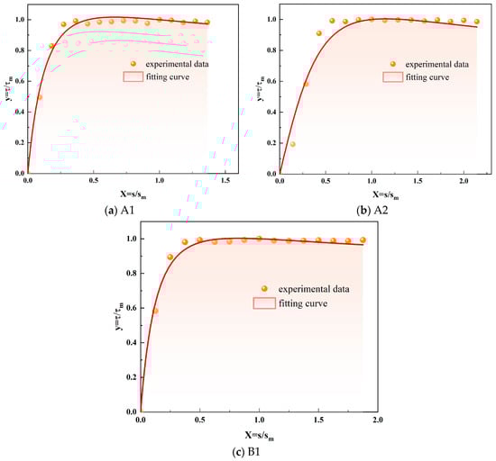 This gives the normalised fitting curve for the load-displacement relationship; the shear stress-shear displacement relationship described below is also processed with this approach. The experimental results and the normalised fitting results are shown in Table 3 and Table 4. Some fitting curves and measured results are shown in Figure 5 and Figure 6. The tests were conducted on unfrozen samples, where A, B, and C represent sand content rates of 50%, 55%, and 60% and 1, 2, and 3 represent the confining pressures of 50 kPa, 100 kPa, and 150 kPa, respectively. Clearly, Equation (4) can fit the pull-out curve and shear displacement curve well and has a high fitting accuracy for all sample curves.