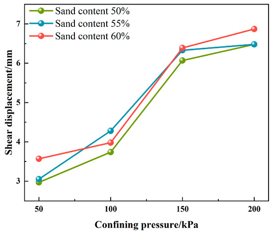 The variation in the displacements corresponding to the peak shear strength is shown in Figure 8. The shear displacements associated with different confining pressures (50 kPa, 100 kPa, 150 kPa, and 200 kPa) for varying sand content percentages (50%, 55%, and 60%) were measured. For a 50% sand content, the shear displacements were found to be 2.97 mm, 3.74 mm, 6.07 mm, and 6.48 mm, respectively. Similarly, for a 55% sand content, the corresponding shear displacements were 3.05 mm, 4.28 mm, 6.33 mm, and 6.49 mm. Finally, for a 60% sand content, the shear displacements at peak shear strengths were recorded as 3.57 mm, 3.98 mm, 6.39 mm, and 6.87 mm at the same confining pressures. It can be concluded that, the greater the applied confining pressure, the greater the displacement of the anchor-soil interface at the peak stress. The smaller circumferential constraints on the anchor and surrounding soil at low confining pressures result in smaller bonding and friction forces at the anchor-soil interface, making it easier for the anchor to reach the stage of plastic deformation and undergo a smaller displacement at the peak strength. At the same confining pressure, the displacement corresponding to the peak strength increases from 2.97 mm to 3.57 mm at 50 kPa when the sand content of the soil body increases from 50% to 60%; it increases from 3.74 mm to 3.98 mm at 100 kPa, from 6.07 mm to 6.39 mm at 150 kPa, and from 6.48 mm to 6.87 mm at 200 kPa. Under the same confining pressure, as the sand content increases, the peak value also slightly increases.